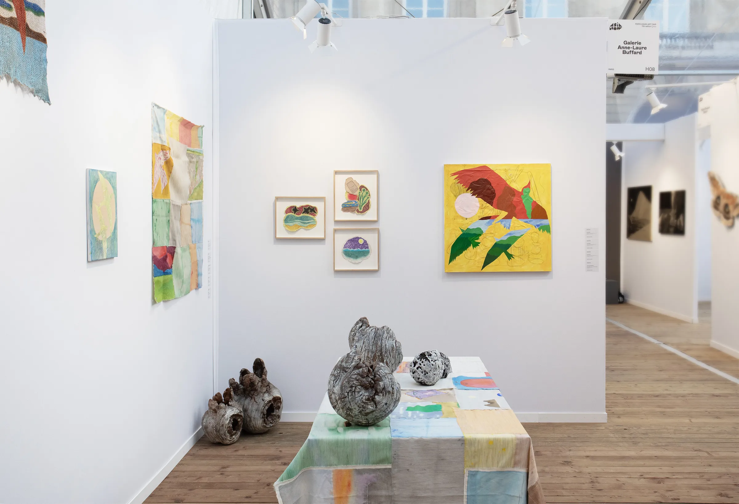 Sous le titre Wrapping Home, le stand propose un dialogue sensible entre deux traditions emblématiques de l’Asie qui évoquent les notions de départ, de déplacement et de renouveau : le bojagi (Corée) et le furoshiki (Japon). Hérités de gestes quotidiens et empreints de symbolisme, ces carrés de tissu qui servent à emballer les objets précieux avant un voyage, une offrande ou un déménagement, deviennent ici matière à création contemporaine et à scénographie d’exposition. À travers un ensemble d’oeuvres mêlant peintures, installations textiles et sculptures telluriques, les trois artistes ré-interprètent cette gestuelle à la frontière du rituel et du soin en explorant les notions de transmission, de transformation et d’aménagement d’un chez soi.Wrapping Home prolonge l’exposition remarquée de Biole et de Dalle Park Chae au Château de la Borie (Limousin) cet été. Une installation à quatre mains des artistes est également à l’honneur Place Vendôme au sein de l’appartement Piaget dans une curation d’Asia Now aux côtés d’oeuvres de Lee Ufan, Tadashi Kawamata, Rithka Merchant… un accrochage visible pendant la semaine de l’art à Paris.